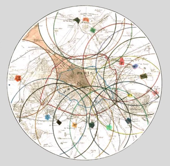 Carte des fortifications de Paris en 1830 (les cercles correspondent à la portée maximale des canons et donc de la possibilité de croiser leurs feux pour se protéger ).