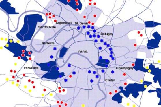 Carte avec tous les forts d'Ile de France ( en bleu : type 1830 , en rouge : type 1874 , en jaune : type 1914 )