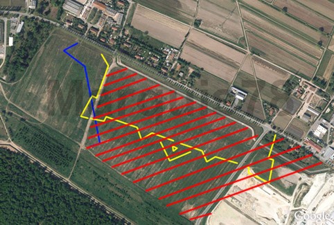 ( en jaune la partie du fort primitf mise au jour , en bleu la partie du fort final mise au jour , en rouge la zone de l'extension prévu de l'usine )